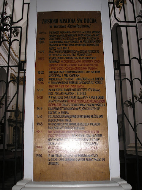 In the porch of the church of St. Spirit, there is a late Baroque epitaph made of black marble - Konstancja Dulfusowa (d. 1747), a wealthy Warsaw townswoman and her son, Pauline January.